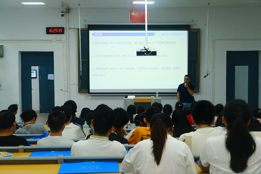 讲座中,曾良平围绕“报考策略”“备考要点”“科目指导”展开:报考策略上,建议优先选限户籍、专业小类、应届的岗位以减少竞争,提醒核对岗位信息避免疏漏;梳理国考、省考等考试时间,引导学生制定多类型备考计划,拓宽上岸路径。